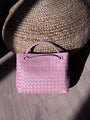 Ha il motivo intrecciato e le sue dimensioni sono: 32x26x12 cm. La chiusura è magnetica, cioè si chiude attraverso una calamita.