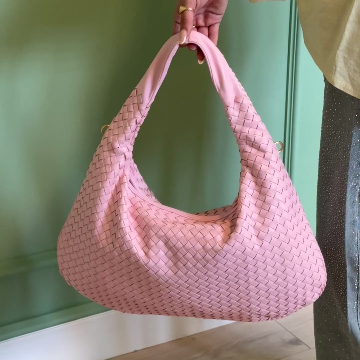 Borsa " Monaco Rosa Light", con motivo intrecciato, da indossare comodamente a spalla grazie al manico di ottima qualità.