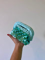 La lavorazione è intrecciata a mano con grande cura, e la superficie è impreziosita da paillettes rotonde in verde smeraldo opaco, applicate fittamente per creare un effetto tridimensionale e dinamico.