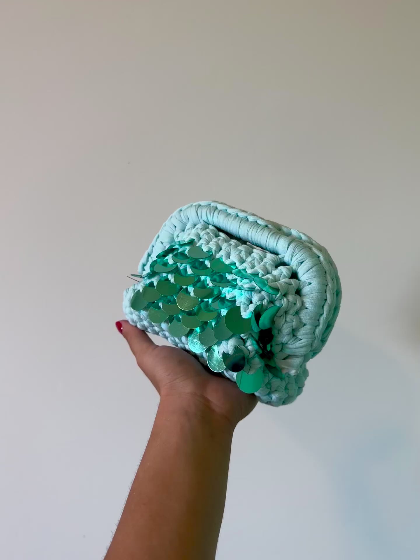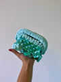 la nostra borsa “pasticcino smal Tiffany paillettes” è un elegante pezzo artigianale realizzato con un filato di alta qualità in cotone morbido, che conferisce al prodotto una finitura lucente e pregiata. Il colore principale è un azzurro acqua brillante, che richiama le sfumature tropicali del mare, perfetto per la stagione estiva.
