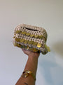 Le sue dimensioni sono: 22x12x8 cm ed è stata realizzata in tessuto cotone e presenta il manico per essere portata a mano, ed è costellata di paiettes oro in tinta, PERFETTA PER L'ESTATE!🌟